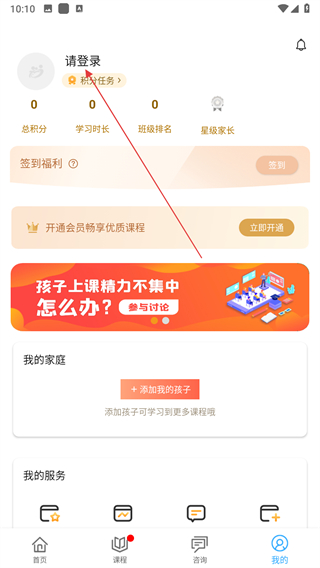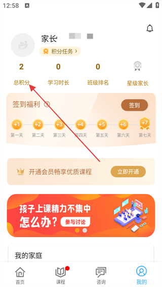2、在我的页面中,点击家长昵称下方的总积分区域,进入我的积分页面。