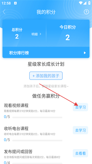 3、找到做任务赢积”板块,点击右侧的去学习按钮,完成对应任务,即可获取积分。