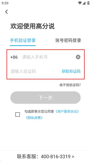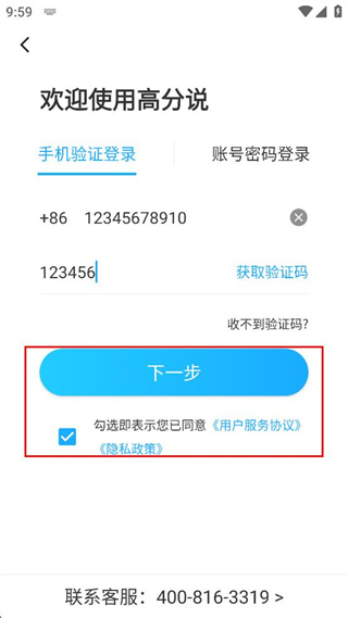 4、填写验证码,勾选同意用户服务协议和隐私政策,点击“下一步”完成登录。