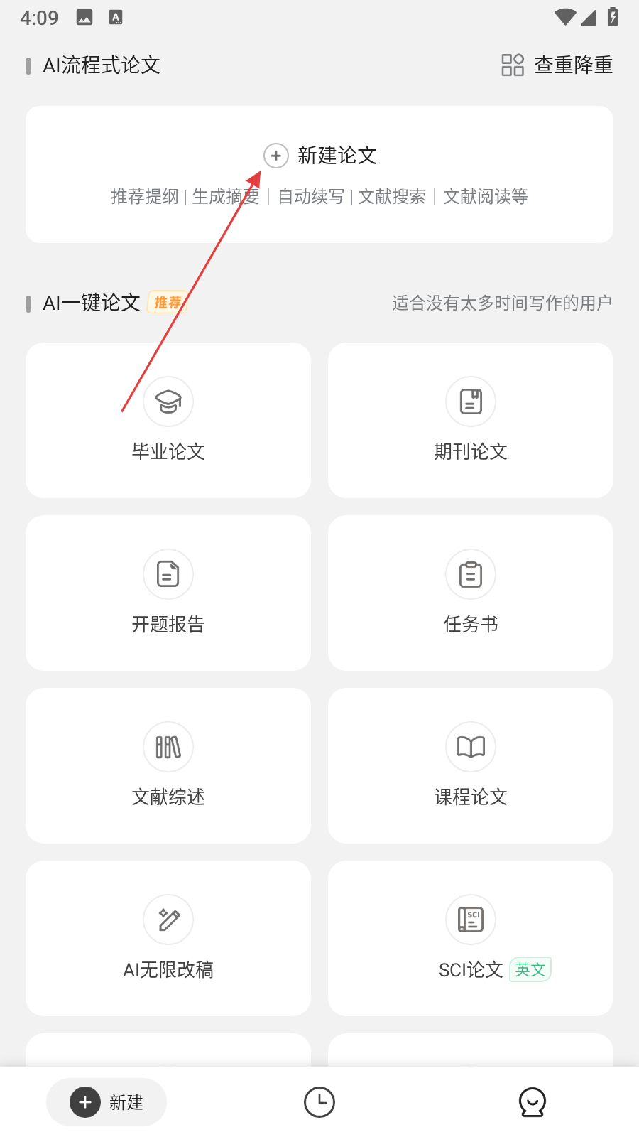 1、打开笔杆论文应用,在界面中找到新建论文按钮并点击。