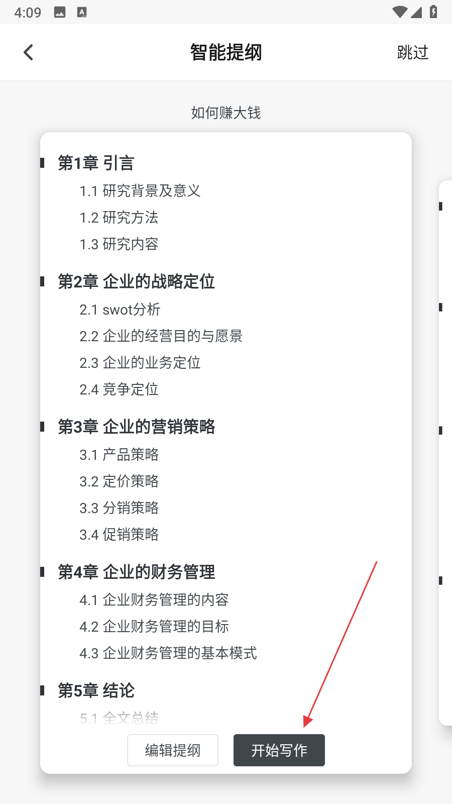 3、在智能提纲页面,可查看系统自动生成的论文提纲,确认提纲后点击开始写作按钮。