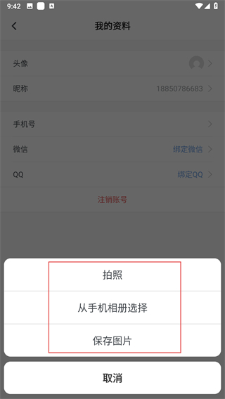 4、在头像操作选择框中选择拍照或从手机相册选择选项即可。
