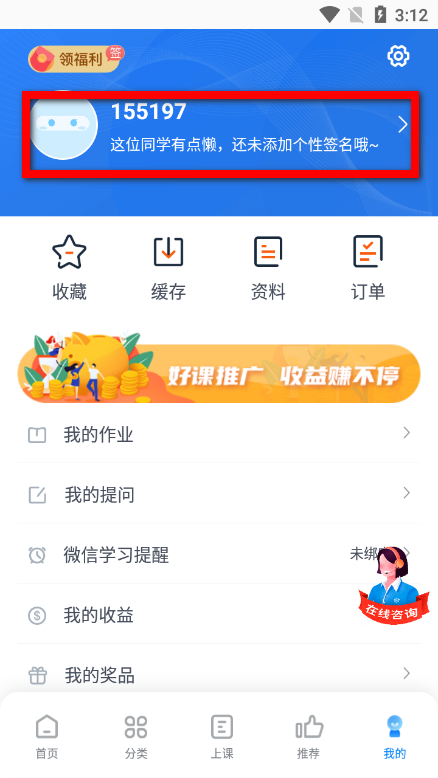 2、在个人中心页面,点击头像及昵称区域,进入个人信息展示界面。
