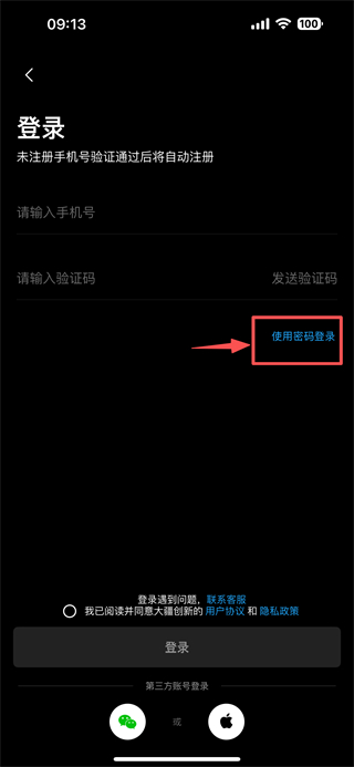 3、在登录页面,点击使用密码登录选项,进入密码登录页面。
