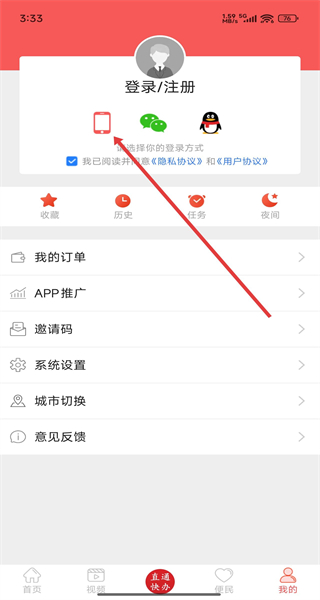 3、在个人中心界面,点击手机图标对应的登录方式,进入手机号登录界面。