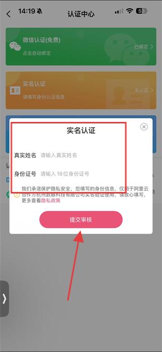 4、在填写框中输入真实姓名和身份证号,点击提交审核,即可完成捡对象APP的实名认证流程。
