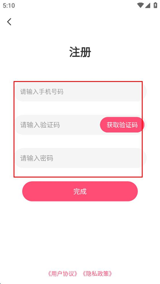 2、在注册页面输入手机号码,获取并输入验证码,设置密码后点击完成。