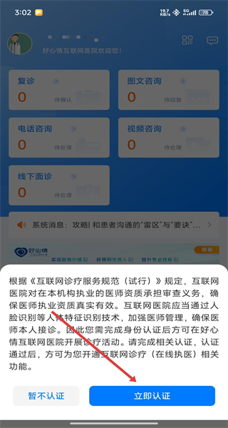 1、在好心情医生版APP首页,点击添加患者选项,弹出身份认证提示框。