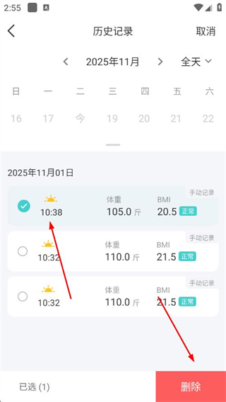 5、勾选要删除的体重记录,点击删除,即可删除体重记录。