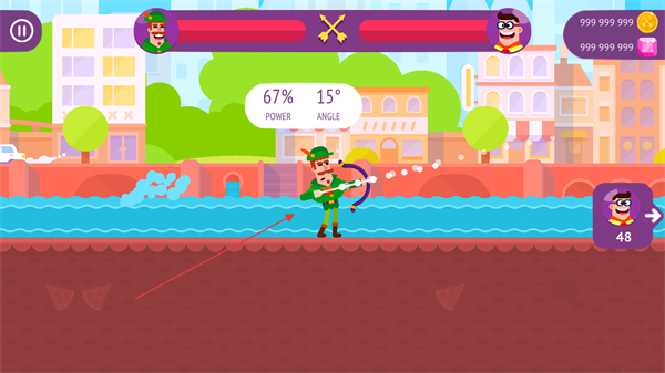 1、通过调整力量和角度来控制箭矢发射,长按屏幕蓄力调整力量,滑动屏幕调整角度,松手即可射出箭矢。