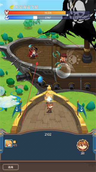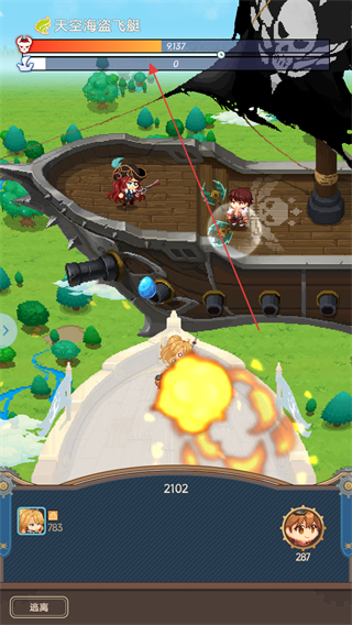 2、战斗中操控角色攻击天空海盗飞艇等敌人,注意敌人的血量条如天空海盗飞艇的血量,持续输出伤害。