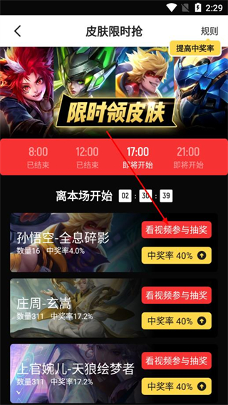 3、选择想要参与的场次,点击看视频参与抽奖,有机会领取皮肤。