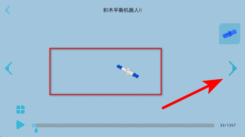3、在积木搭建界面,按照步骤逐步组装积木,点击右侧箭头进行下一步操作,完成机器人的搭建。