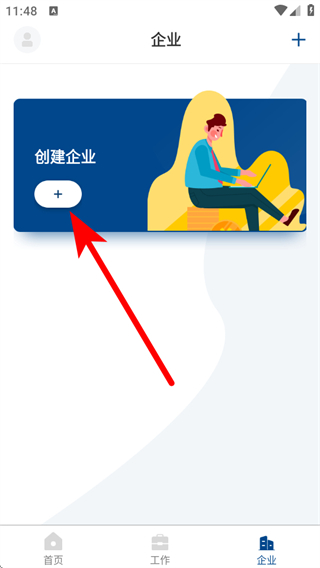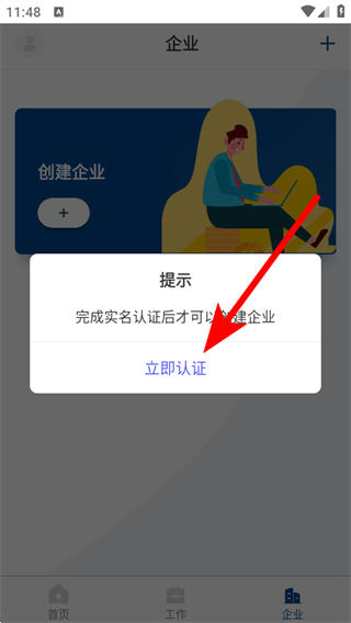 2、在企业页面点击创建企业的加号按钮,触发认证提示。