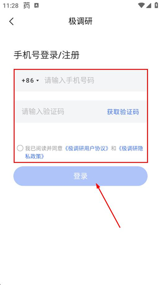 3、在登录界面输入手机号码,获取并输入验证码,勾选协议,点击登录。