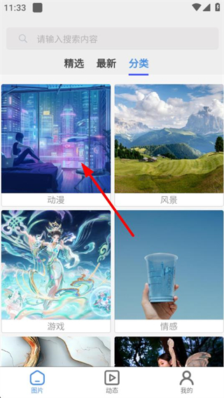2、在分类选择页面,点击动漫分类,进入动漫壁纸列表页面。