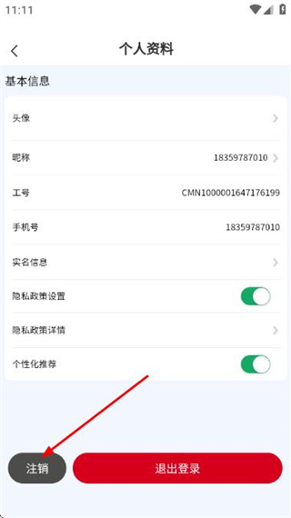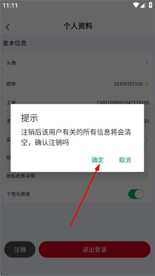 3、在个人资料页面点击注销按钮,弹出注销确认提示框。