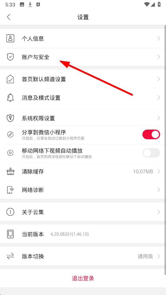 3、在账户与安全页面中,找到注销账户选项并点击,按照app后续给出的提示和流程操作,完成在云集app上的账号注销。