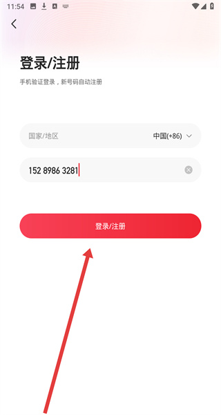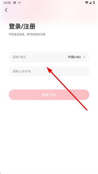 3、在进入到登录注册页面中时,可以点击输入框填写手机号码后,点击按钮进行登录。
