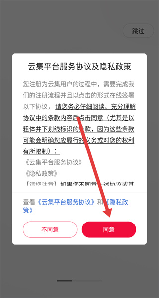 1、点击“云集平台服务协议及隐私政策”弹窗的“同意”,进入云集APP首页。