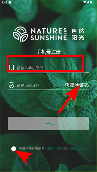2、在注册界面,输入手机号码并点击获取验证码,同时勾选同意协议。