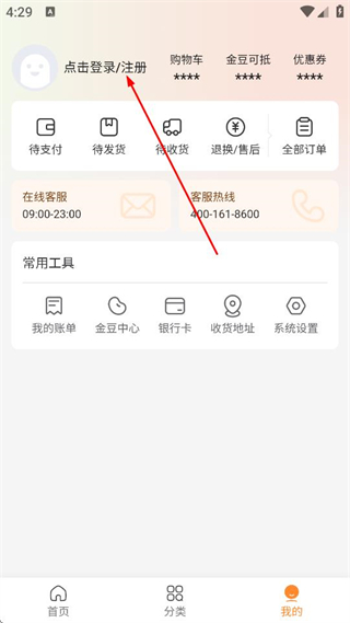 2、在个人中心页面,点击点击登录/注册,进入登录注册页面。