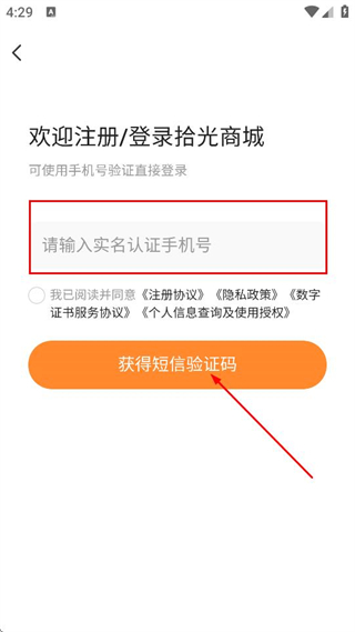 3、在登录注册页面,输入实名认证手机号,点击获得短信验证码。