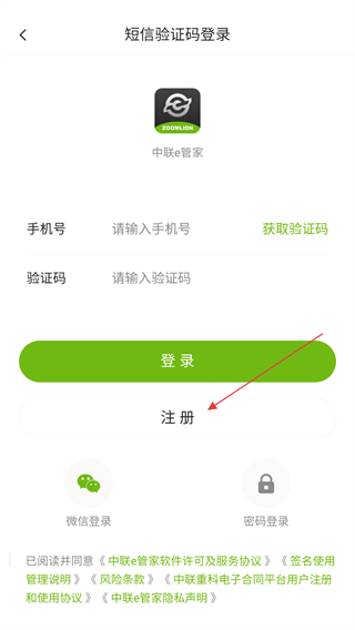 2、进入验证码登录的页面内,点击下方注册的按钮。