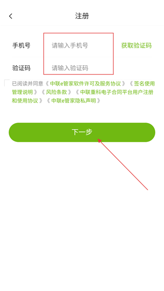 3、进入注册的界面内,输入手机号、验证码再点击下一步。
