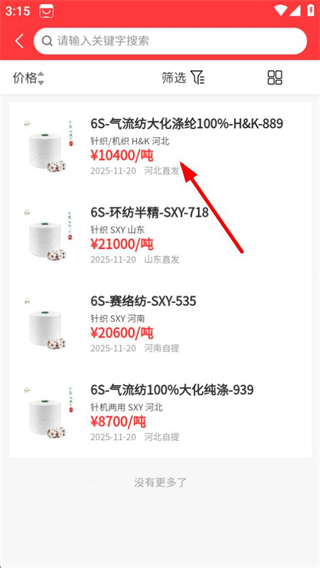 2、在分类页面,选择目标纱支,进入对应商品列表页面。