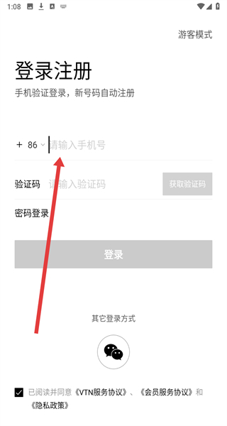 2、在进入到登录注册页面中,可以点击输入框填写新手机号码,进行注册登录操作。