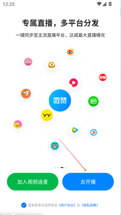 1、首先打开下载好的微赞APP,进入软件后会有两个登录类型选择,分别是加入视频连麦和去开播选项,用户根据自己的需求进行登录;