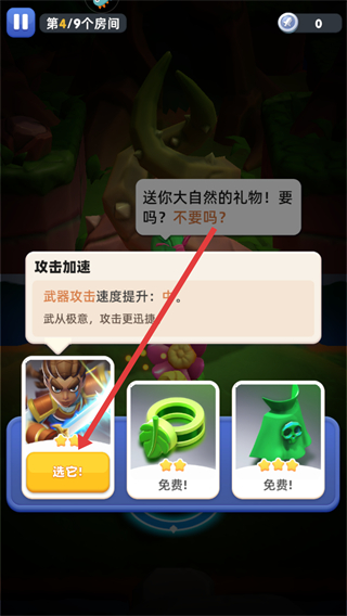 3、在房间中会遇到自然精灵赠送礼物的情况,需根据自身需求选择,如选择攻击加速类奖励可提升武器攻击速度。