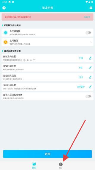 1、在自动阅读助手的阅读配置页面,点击右下角关于选项,进入关于界面。