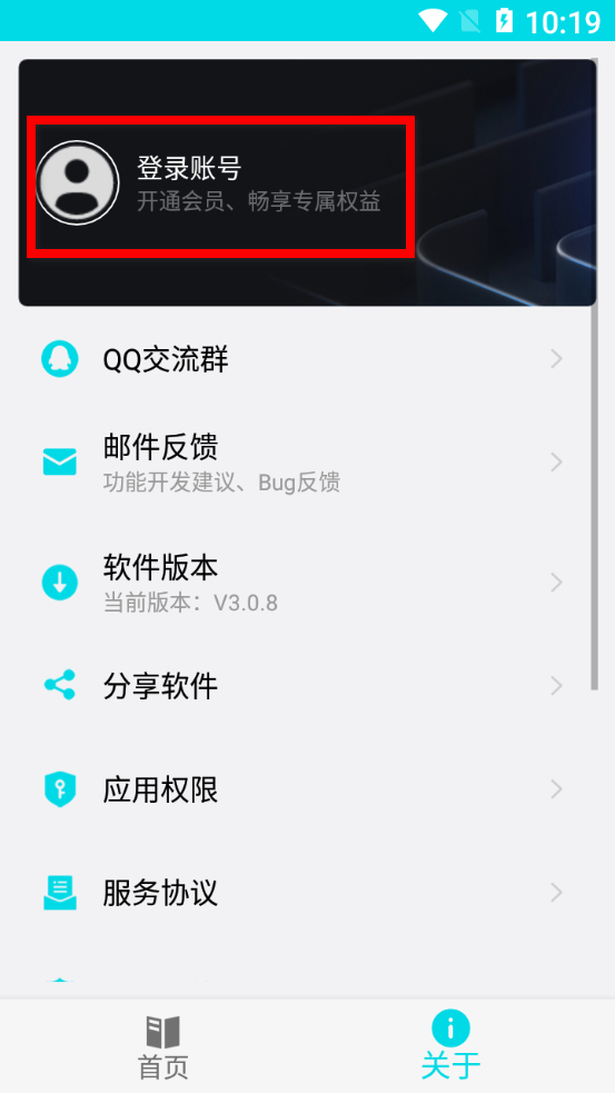 1、打开自动阅读助手APP,进入阅读配置页面,点击底部关于按钮,跳转至登录引导界面。