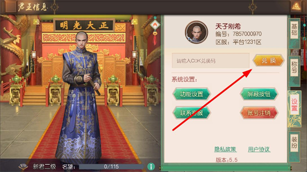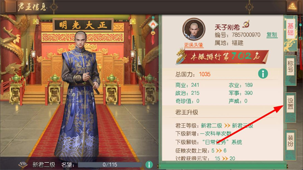 2、在君王信息界面,点击右侧设置选项,进入设置界面。