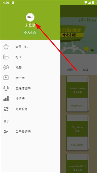 1、在剑桥英语小说馆app首页,点击左上角菜单按钮,展开侧边栏。