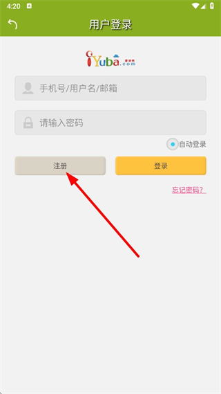 4、在用户登录界面,点击注册,进入用户注册界面。