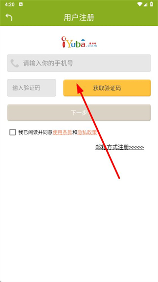 5、在界面输入手机号,获取验证码输入,勾选同意使用条款后,点击下一步按照提示完成注册。