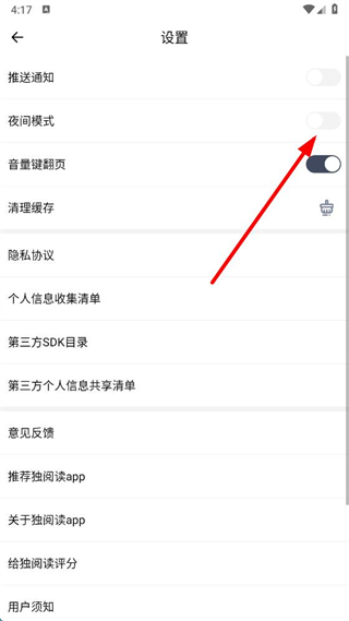3、在设置界面,找到夜间模式选项,点击其右侧的开关按钮,即可打开夜间模式。