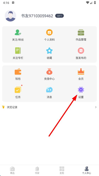 1、在独阅读小说app首页,点击右下角个人中心按钮,进入个人中心界面。