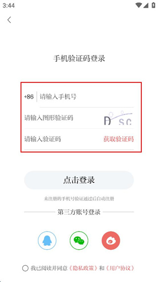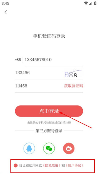 4、勾选我已阅读并同意隐私政策和用户协议,点击登录。