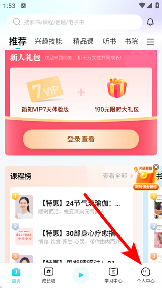 1、在简知app首页,点击右下角个人中心选项,进入个人中心界面。