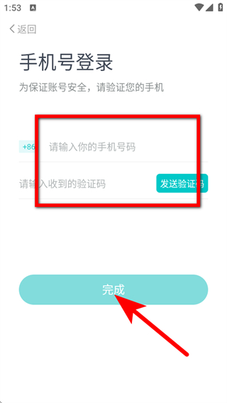 4、在手机号登录页面,输入手机号码和验证码后,点击完成按钮完成登录操作。