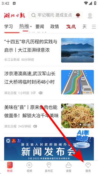 1、打开湖北日报app,需要点击底部服务,进入服务的页面。