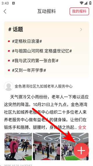 3、在互动报料页面点击右下角+号,进入报料编辑的页面。