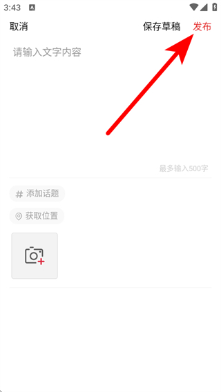 4、在编辑页面输入文字内容,添加话题等信息,编辑完成后点击发布。