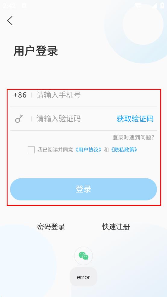 4、在用户登录页面,输入手机号,点击“获取验证码”,收到后输入验证码,勾选相关协议,点击“登录”按钮完成登录。