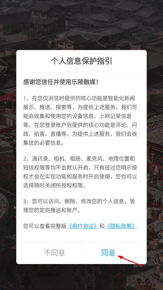 1、打开乐陵融媒APP,出现个人信息保护指引界面,仔细阅读后点击“同意”,进入主界面。