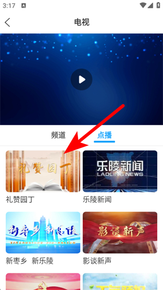 1、打开乐陵融媒app,在首页点击视听内容服务中心,进入电视页面。